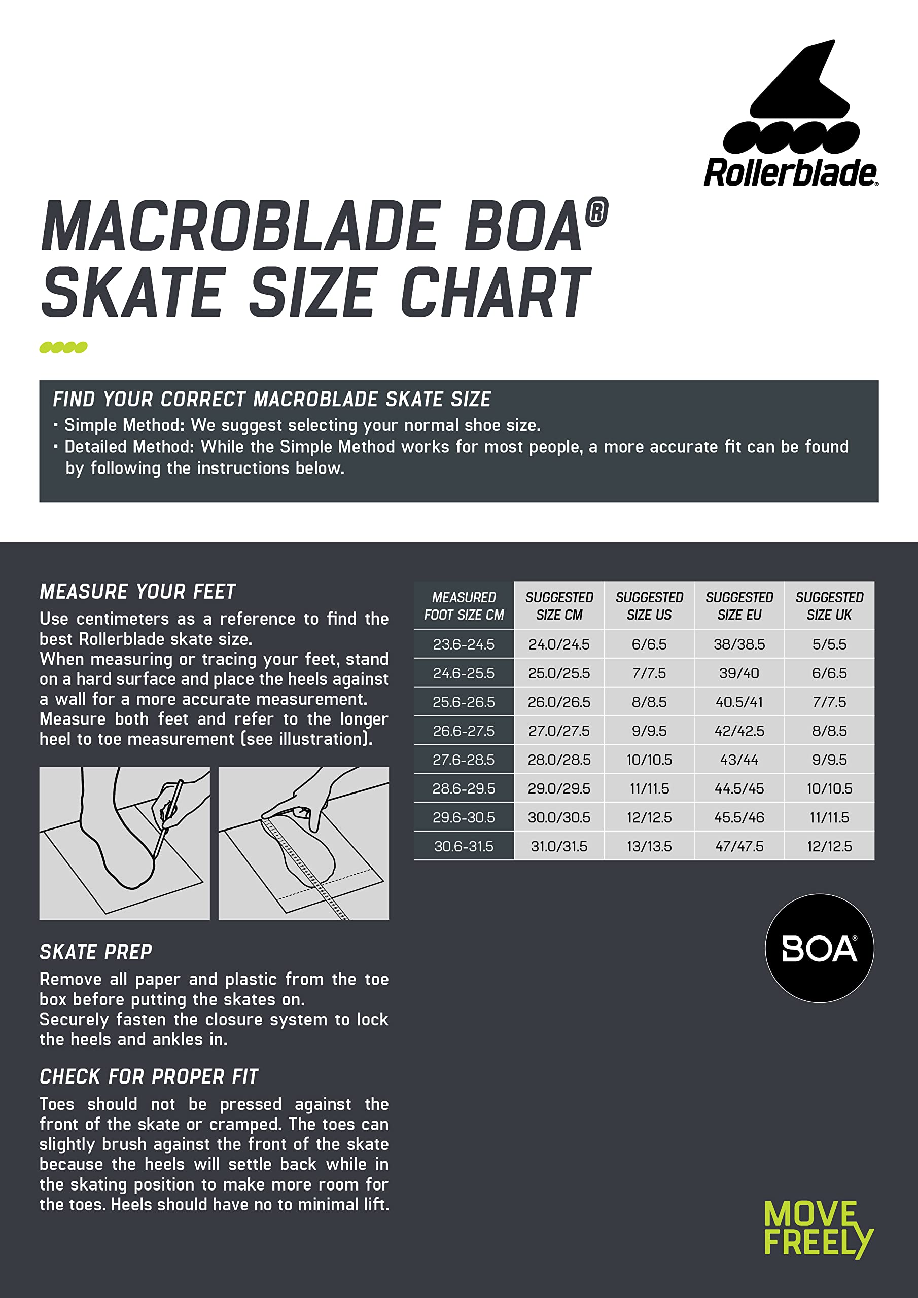 Details: Engineered for speed and performance, the Macroblade BOA® 110 is the ideal skate for advanced skaters who want to go faster with superior support and comfort. The BOA® Fit System gives you a fast, effortless fit. Just turn the dial to get a precise adjustment that’s quick, secure, and stays that way while you skate. The upgraded Flyknit upper enhances breathability and provides an improved foot-wrapping fit, while the new cuff adds extra support for better control and overall comfort. The redesigned memory buckle system ensures a secure fit. Once adjusted, the lever stays in position for every session, making it fast and easy to put on. Need to fine-tune your fit? The Footboard Sizer lets you customize the interior - keep it in for a snug, performance feel or remove it for a roomier fit. A 3x110mm Hydrogen SE wheel setup, combined with Twincam ILQ-9 Classic Plus bearings, delivers smooth, high-speed performance. Additional upgrades include new hinge rivets to improve stiffness and energy transfer, so you get more power in every stride. Brake in the box.
